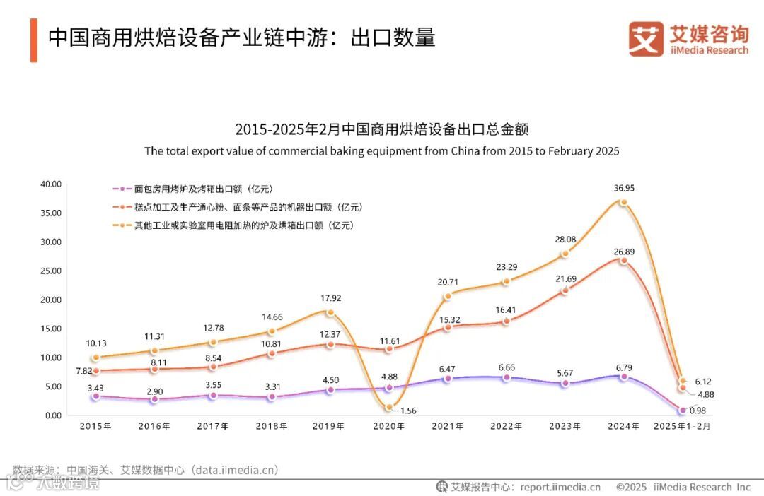 数据显示,2015年至2024年,面包房用烤炉及烤箱出口额从3.43亿元上升至6.79亿元。糕点加工及生产通心粉、面条等产品的机器总出口额也从2015年的7.82亿元上升至2024年的26.89亿元,增速迅猛。其他工业或实验用电阻加热的炉及烘箱出口额在2020年后增速加快,屡创新高,2024年达36.95亿元。艾媒咨询分析师认为,中国商用烘焙设备出口量逐年攀升,主要得益于国际市场需求扩张、中国产品性价比优势及产业链技术升级。出口增长不仅扩大全球市场份额,也倒逼国内产业升级,中国商用烘焙设备企业应持续加强技术创新,拓展新兴市场,并警惕国际贸易风险,巩固竞争优势。