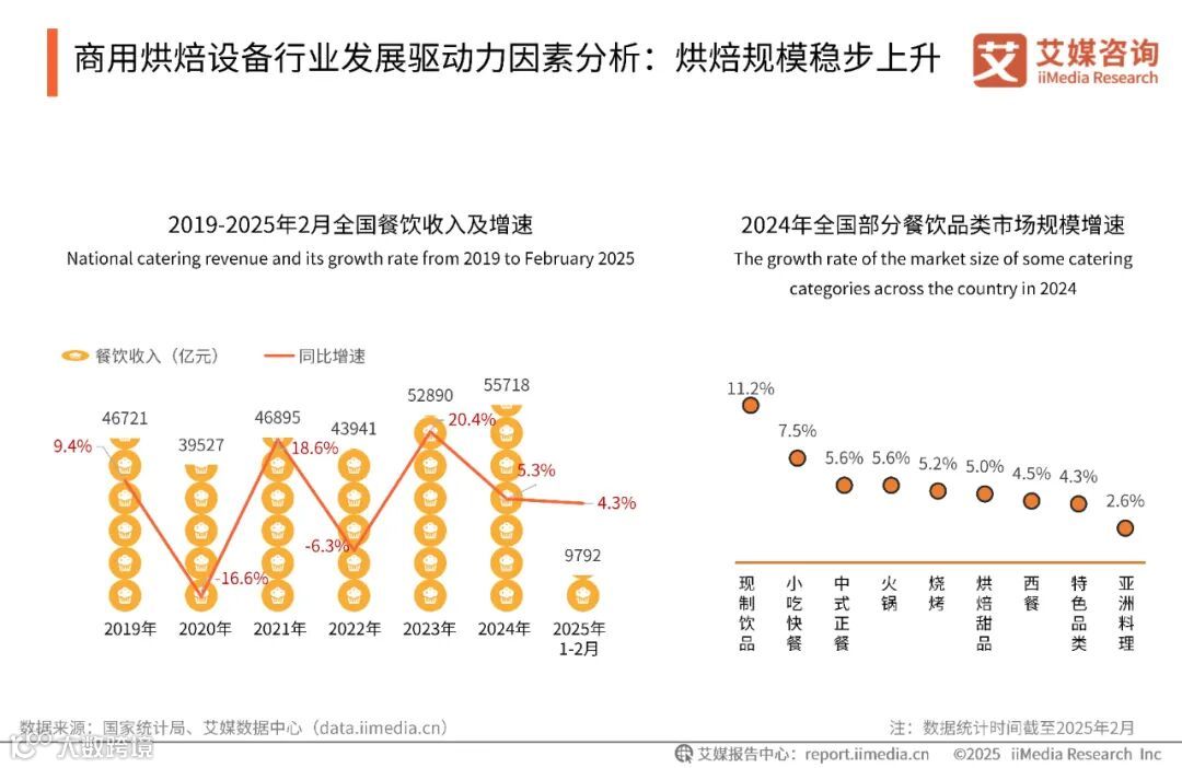 数据显示,中国餐饮市场呈现出稳步增长的态势,2024年全国餐饮收入已达到55718亿元,同比增长5.3%。不少餐饮品类在2024年展现出了良好的增长潜力,现制饮品以11.2%的增速居于首位。艾媒咨询分析师认为,饮品门店为提升客单价和场景体验,普遍采用“现制饮品+烘焙”复合模式,直接刺激中小型烘焙设备采购需求;同时消费升级推动连锁品牌加速设备智能化升级,以提升标准化效率和产品创新力。商用烘焙设备企业需紧抓细分场景需求,针对性开发高性价比、易操作的设备,并配套提供运维培训等增值服务,帮助下游客户降本增效,从而在行业扩容中抢占先机。