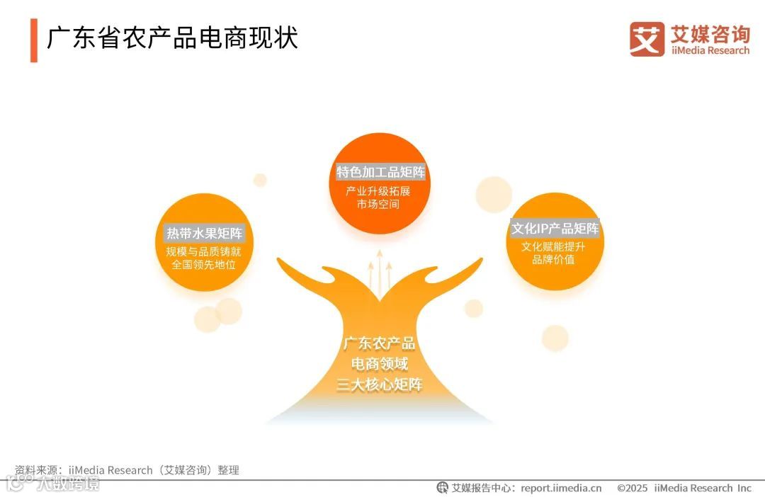 广东农产品电商已构建起“热带水果+特色加工品+文化IP产品”三大核心矩阵。热带水果矩阵以规模与品质奠定全国领先优势;特色加工品矩阵通过产业升级持续拓展市场;文化 IP 产品矩阵依托深厚历史底蕴,以文化赋能提升品牌价值,彰显独特魅力。
