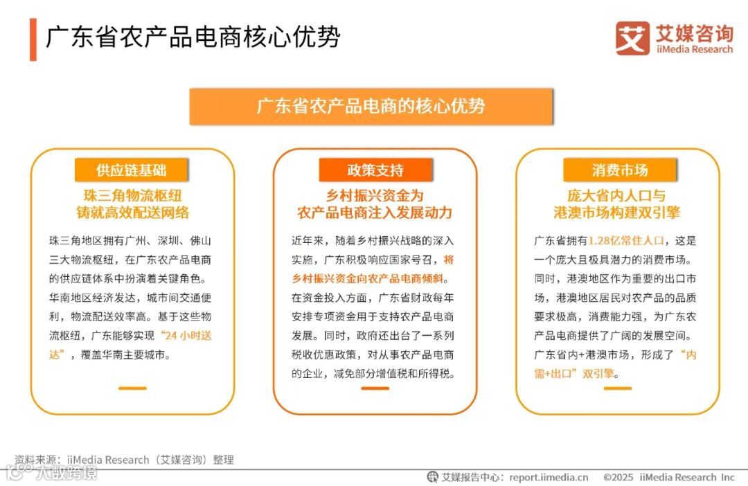 iiMedia Research(艾媒咨询)数据显示,2024年中国农产品电商销售规模突破1.6万亿元,达16025亿元。其中,广东省以3120亿元的规模领跑全国,占全国总量的19.5%,六年蝉联全国榜首。作为农业大省,广东通过电商平台成功开辟新型销售渠道,这一创新发展模式已成为全国农产品电商发展的典范。