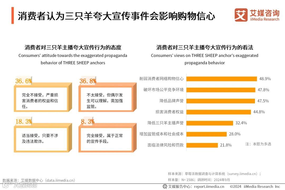 iiMedia Research(艾媒咨询)调研数据显示,对于三只羊主播夸大宣传月饼的行为,36.6%的消费者表示完全不能接受,认为这种行为严重损害消费者的权益和信任;36.8%的消费者表示不太接受,但偶尔发生可以理解。公众对于三只羊主播夸大宣传商品的行为持批评态度,不少消费者认为这种夸大宣传的行为会削弱消费者网络购物信心(48.9%)、破坏市场公平竞争环境(47.8%)以及降低品牌声誉(47.5%)。