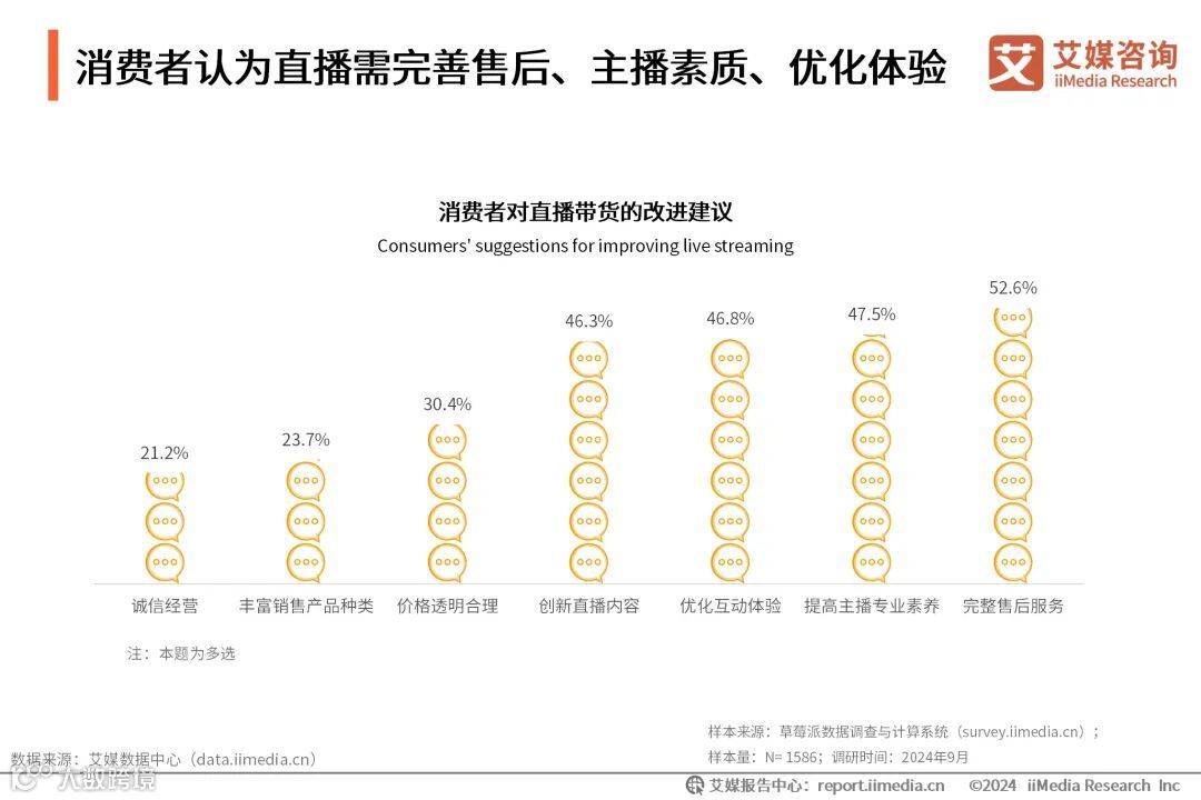 iiMedia Research(艾媒咨询)调研数据显示,52.6%的消费者表示应该完善“直播带货”的售后服务,不少消费者希望提高主播专业素养(47.5%)和优化互动体验(46.8%)。售后服务是消费者购物体验中不可或缺的一环,消费者期望便捷的退换货流程和专业的售后咨询等服务,而主播作为直播带货的核心角色,其专业素养和表现直接影响消费者的购买决策和购物体验,有关部门应从售后服务和主播两方面入手,推动行业健康发展。