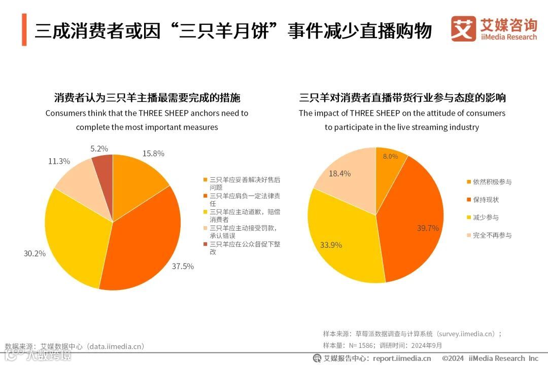 自2024年9月12日美诚月饼被爆出与宣传不符后,三只羊一直沉默,“装聋作哑”不作回应的态度引发消费者议论。iiMedia Research(艾媒咨询)调研数据显示,消费者认为三只羊应肩负一定法律责任(37.5%)和主动道歉并赔偿消费者(30.2%)。三只羊的沉默影响了消费者对待直播带货行业的参与意愿,33.9%的消费者表示将减少参与,18.4%的消费者表示将完全不再参与直播带货活动,直播行业面临巨大的信任危机。