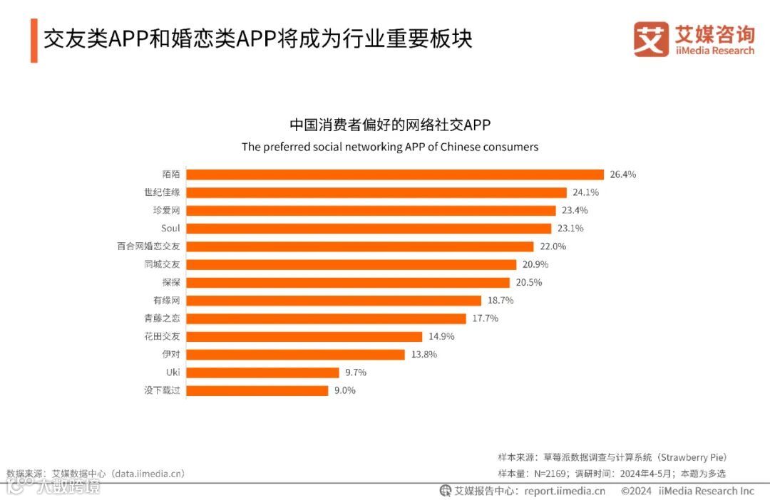 iiMedia Research(艾媒咨询)数据显示,婚恋社交平台推出的APP中,世纪佳缘、珍爱网、百合网婚恋交友等APP受消费者欢迎,分别占比24.1%、23.4%、22.0%;陌生人社交APP中,陌陌(26.4%)和Soul(23.1%)更受消费者喜爱。艾媒咨询分析师认为,陌陌、Soul等以陌生人社交为主的APP,通过强化社交、心灵上的慰籍以满足国民对社交以及恋爱的需求,拓宽了婚恋社交服务行业的服务模式。