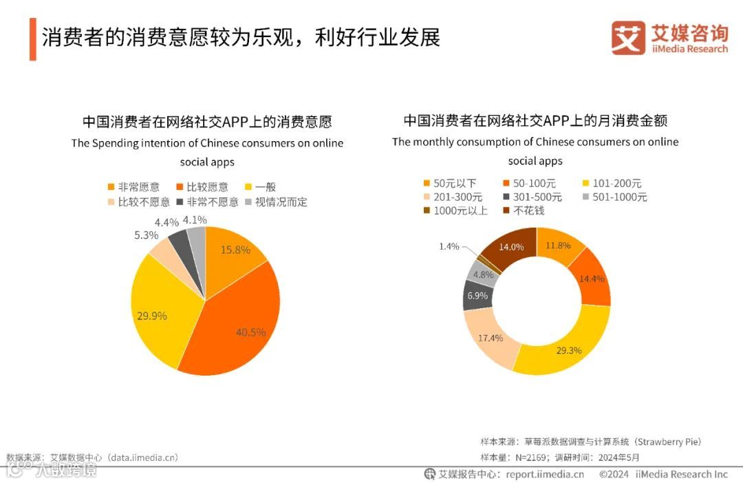 iiMedia Research(艾媒咨询)数据显示,有56.3%的用户愿意购买网络社交APP提供的付费服务,其中15.8%的用户消费意愿强烈;每月在网络社交APP上消费金额为50-300元的用户占61.1%,有14.0%的用户基本不在网络社交APP上消费。艾媒咨询分析师认为,消费者在网络社交APP付费服务的消费意愿上表现相对良好,月消费金额不高,其原因可能在于该类APP提供的付费服务较少或性价比较低。