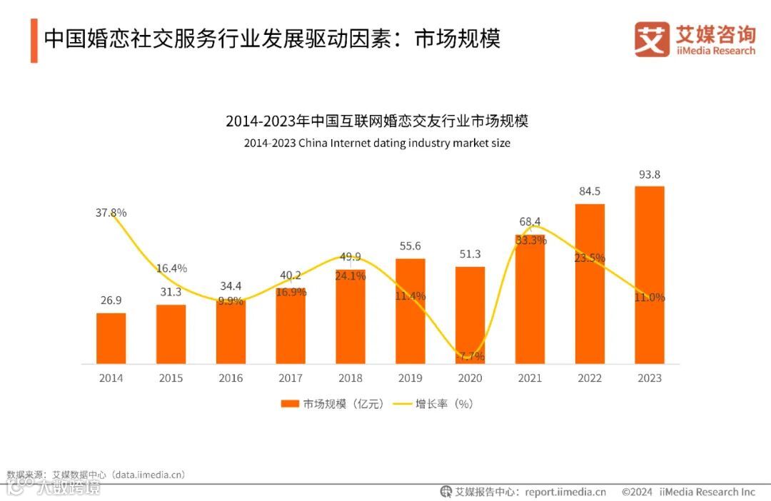 市场规模:中国婚恋社交服务市场规模呈增长态势,2023年市场规模达93.8亿元