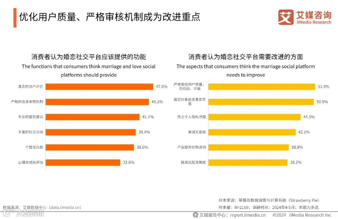 iiMedia Research(艾媒咨询)数据显示,真实的用户评价(47.0%)、严格的信息审核机制(45.1%)成为消费者最希望婚恋社交平台提供的功能,严格管控用户质量、防低俗、诈骗(51.5%)以及婚恋对象信息真实可靠(50.9%)成为消费者认为婚恋社交平台最需要改进的方面。艾媒咨询分析师认为,用户质量、信息可靠度等是婚恋社交平台提供其他服务的基础,平台需要优化用户质量、严格审核机制以提高平台信誉和用户的信任度。