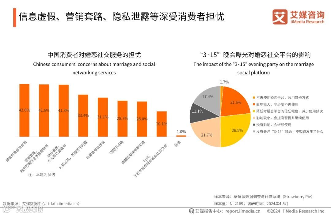iiMedia Research(艾媒咨询)数据显示,超四成消费者对婚恋社交服务中的婚恋对象信息虚假(42.0%)、营销套路(41.6%)、隐私泄露(41.3%)等方面表示担忧;近半数人因“3·15”晚会曝光的婚介平台乱象而降低使用频率。艾媒咨询分析师认为,多数消费者对婚恋社交服务的可信度表示担忧,主要原因有部分婚介平台的营销套路乱象、部分社交APP电信诈骗泛滥以及个人信息泄露遭滥用等。
