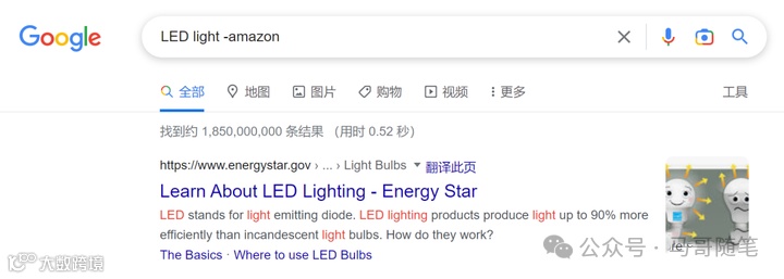 比如,我们想要查找LED灯的供应商,但不想看到来自亚马逊的结果。