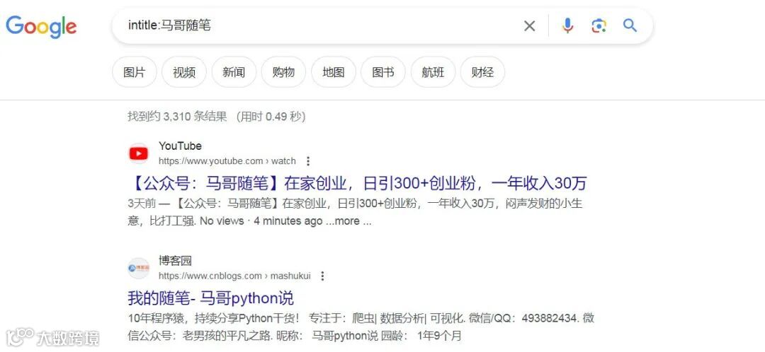 输入搜索指令:intitle:马哥随笔
