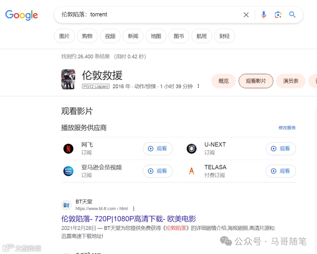 我们只需要在谷歌上面搜索关键词“伦敦陷落”,然后冒号后面加上种子的文件类型