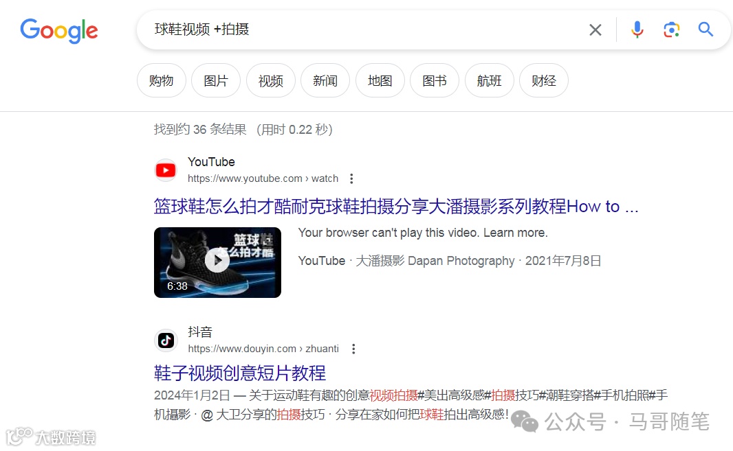 或者搜索“球鞋视频 +拍摄”,就只会显示同时包含“球鞋”和“拍摄”关键词的内容。
