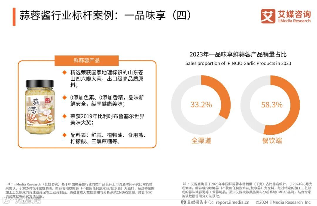 2016年,一品味享推出了鲜蒜蓉产品,成为市场上的开创性品牌【1】。一品味享鲜蒜蓉注重原料的选择,使用新鲜、优质、无农残和重金属的出口级大蒜原材料生产,确保产品的纯正口感和营养价值。其产品强调“0添加”,不使用人工添加剂,满足市场的健康消费需求。其凭借独特的风味和高品质,迅速赢得了广大消费者的青睐,iiMedia Research(艾媒咨询)数据显示,一品味享鲜蒜蓉产品2021-2023年连续三年全渠道及餐饮端全国销量第一【2】;其中,2023年全渠道及餐饮端销量(千克)占比分别为33.2%、58.3%。