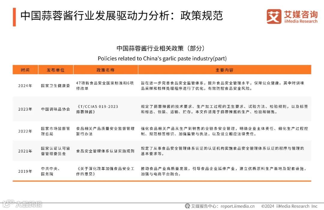 近年来,各政府部门出台了一系列政策与标准,共同织密食品安全监管网络,注重蒜蓉酱行业的规范化发展。2023年11月,中国调味品协会发布了《T/CCIAS 019-2023 蒜蓉辣酱》文件,为蒜蓉酱行业创造了良好的发展环境,促进整个产业链的优化升级与可持续发展。