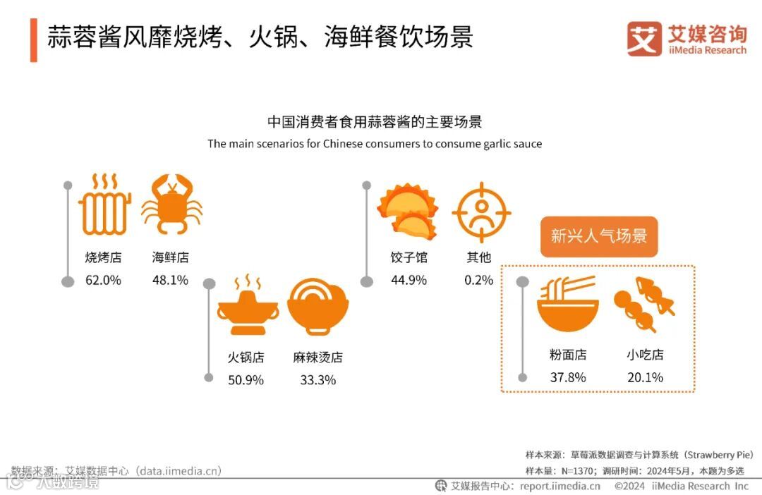 蒜蓉酱在多种不同的餐饮场合中扮演着重要角色。iiMedia Research(艾媒咨询)数据显示,烧烤店、海鲜店、火锅店、麻辣烫店、粉面店等场所是消费者食用蒜蓉酱的主要场景。蒜蓉酱作为一种多用途的调味品,能完美融入烧烤、海鲜、火锅等食材中,提升整体的味觉体验。此外,它也常用于蒸菜、拌面、拌饭、沙拉等,甚至应用在新兴的餐饮场景中,如创意料理、西式简餐、轻食等。