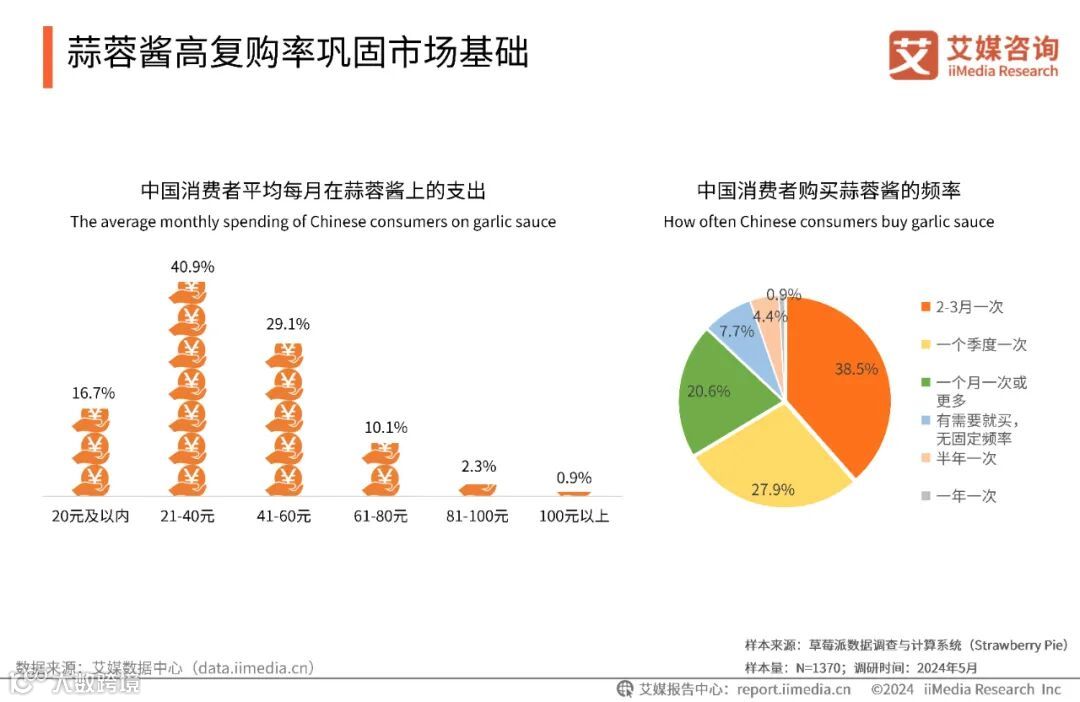 iiMedia Research(艾媒咨询)数据显示,大部分消费者每月在蒜蓉酱上的花费集中在21-40元区间。在购买频率方面,38.5%的消费者倾向于每2-3个月采购一次;20.6%的消费者选择每月至少购买一次,蒜蓉酱已成为众多家庭厨房的常备调味品,其需求虽不至每周必购,但仍维持在一个较高的复购率水平。