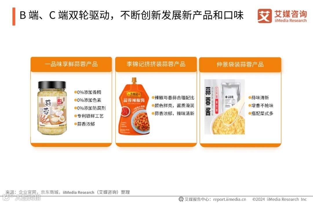 iiMedia Research(艾媒咨询)数据显示,2024年中国调味品市场规模将达6871亿元。得益于食品工业化进程的加快、预制菜产业的迅猛发展与B端餐饮市场的不断壮大,餐企连锁化、出海趋势明显,进一步推动了调味品的需求增长。中国调味品市场蓬勃发展的态势为蒜蓉酱行业注入强劲动力,伴随消费者口味多样化与健康意识的提升,蒜蓉酱以其独特的风味与应用广泛性,在传统与新兴餐饮领域及食品工业领域不断拓展市场版图,成为调味品行业中增长亮点。