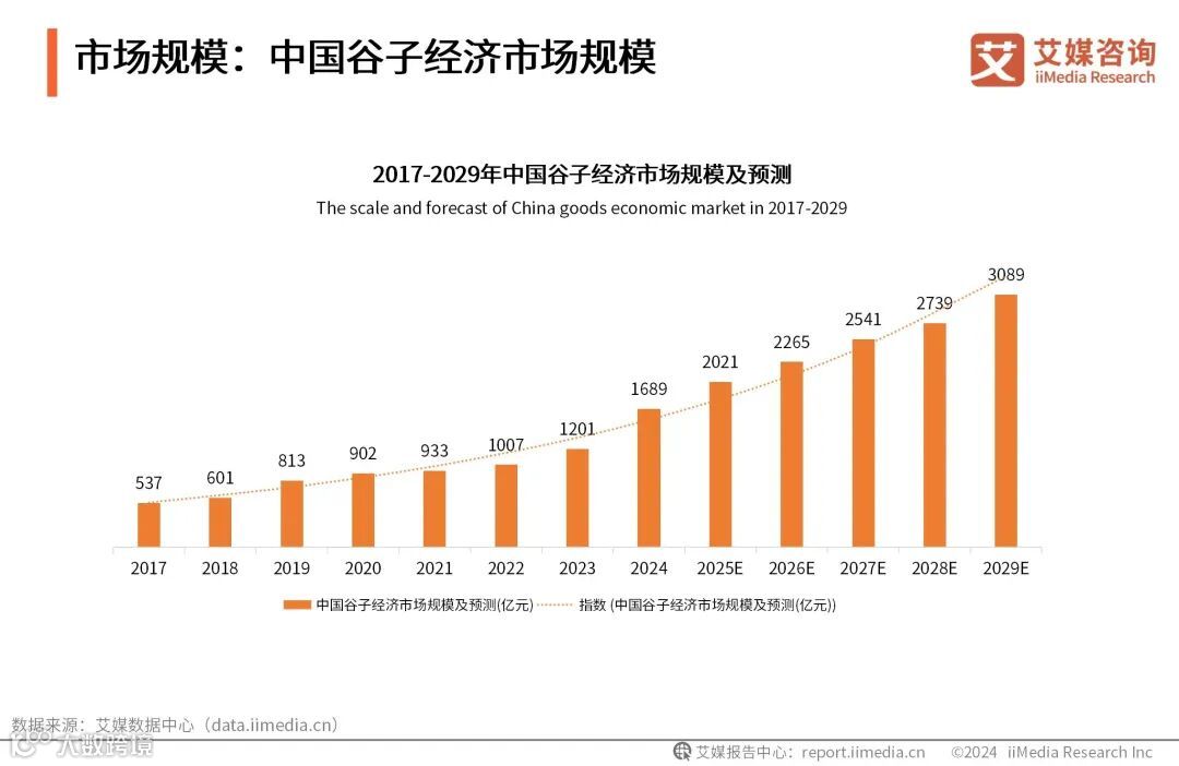iiMedia Research(艾媒咨询)数据显示,中国谷子经济市场规模呈上升趋势,增长速度加快。2024年中国谷子经济市场规模达1689亿元,较2023年增长40.63%。艾媒咨询分析师认为,谷圈文化的兴起引发新的消费热潮,谷子经济带来新的市场机遇,未来谷子经济市场将差异化繁荣发展。
