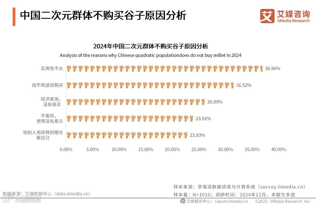 iiMedia Research(艾媒咨询)调研数据显示,在二次元群体中,未购买过谷子商品的人群的主要认为谷子商品实用性不大,占比为36.96%。艾媒咨询分析师认为,目前市面上的谷子主要以收藏价值与展示价值为主,这与实用主义者的需求相悖。