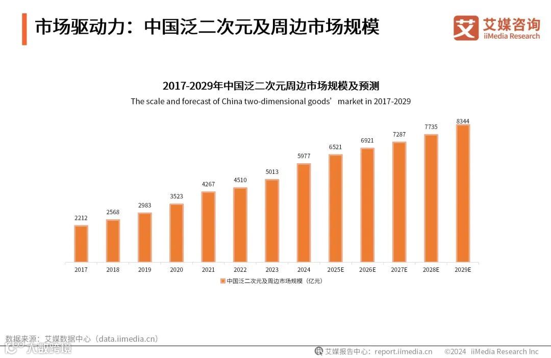 iiMedia Research(艾媒咨询)数据显示,中国泛二次元及周边市场规模呈逐年上升趋势。2019年中国泛二次元及周边市场规模为2983亿元,2024年则迅速提升至5977亿元,2029年则有望达到8344亿元。艾媒咨询分析师认为,随着当代年轻消费者对精神消费需求的提升,泛二次元产业将成为年轻人的消费新趋势。