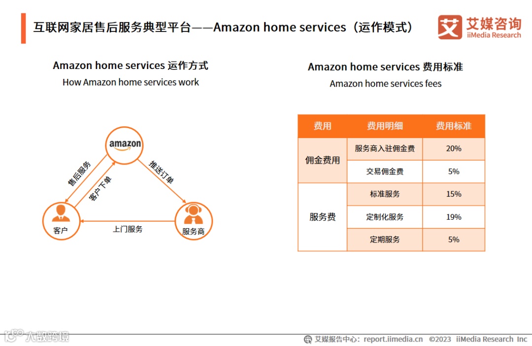 在Amazon home services的运作方式中,亚马逊为客户和服务提供商的中间人,客户通过亚马逊这一网络平台购买服务,提供商在接收订单后上门服务,后由亚马逊提供售后服务。服务商可在亚马逊网站上在线申请服务,佣金费为20%。服务可分成标准服务、定制化服务与定期服务三类,亚马逊统一从交易价格中抽取5%的佣金,其中还存在不同比例的平台费用,如标准服务是15%,定制化服务是19%,定期服务为5%。