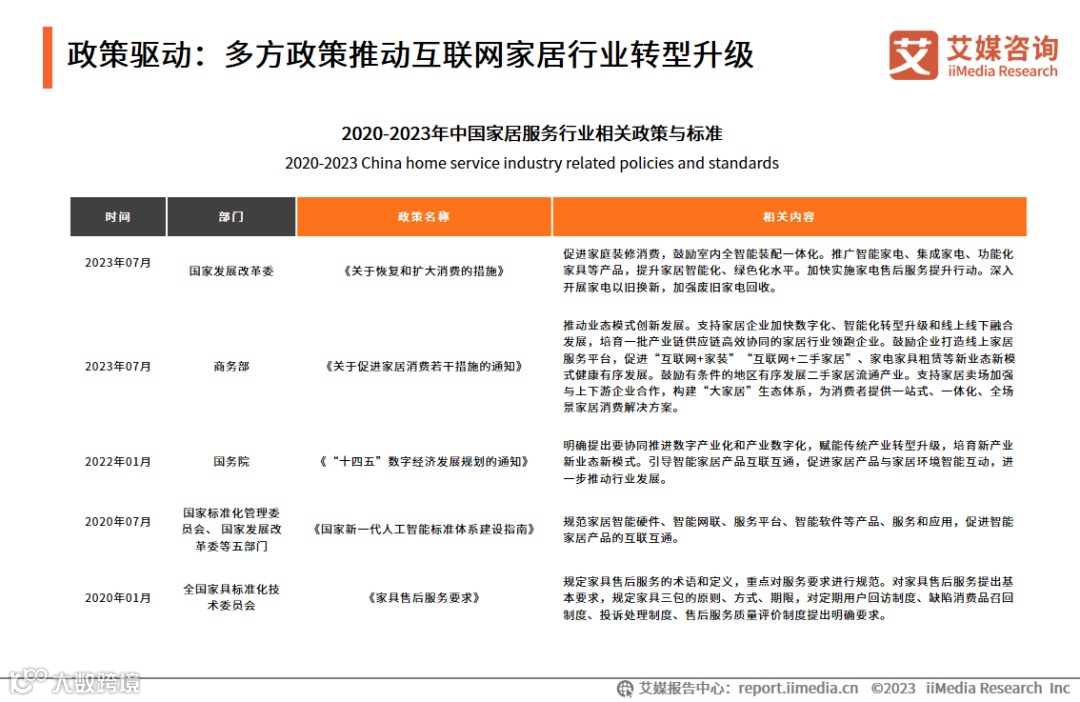 2023年始,中国高度重视扩内需、促消费工作,家居消费涉及领域多、上下游链条长、规模体量大,采取针对性措施加以提振,带动居民消费增长和经济恢复。2023年7月,商务部等13部门联合印发《关于促进家居消费若干措施的通知》,鼓励企业打造线上家居服务平台,促进“互联网+家装”“互联网+二手家居”、家电家具租赁等新业态、新模式健康有序发展。