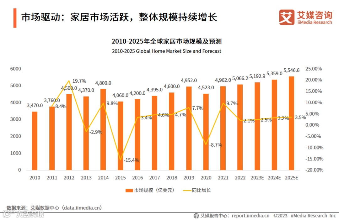 市场规模:全球家居市场发展稳中向好,预计2025年全球家居市场规模达5546.6亿美元