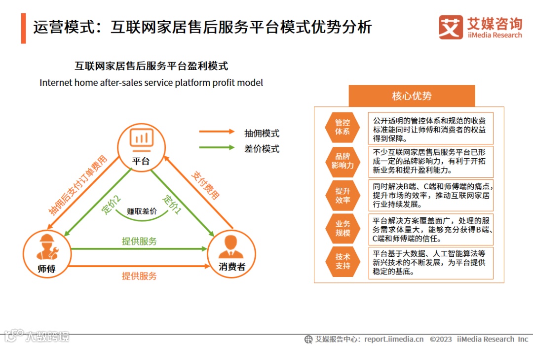 随着互联网和数字科技不断向家居领域渗透,售后服务模式也随之改变,消费者对个性化、便捷化的服务需求不断增长,专业的互联网家居售后服务平台涌现,其在管控体系、品牌影响力、效率业务规模和技术等方面更具优势。互联网家居售后服务平台主要有抽佣模式和差价模式,前者是平台作为中介,抽取一定比例的服务费,后者是平台分别向消费者和师傅报价,从中赚取差价。