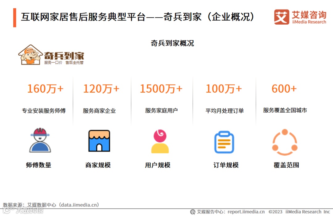 奇兵到家是广西阿泰信息科技有限公司旗下从事全国家居售后服务的互联网平台,为家居电商解决“最后一公里”的配送、安装和维修等问题。其业务范围覆盖全国600多个城市近3000个县区40000多个乡镇,服务商家企业120多万家,服务家庭1500多万个,平台及师傅好评率达99.55%,为商家节省售后运营45%的成本。奇兵到家平台模式的核心优势是解决急单、偏远单,拥有完善的服务体系、严格的师傅准入制度和培训管理机制。