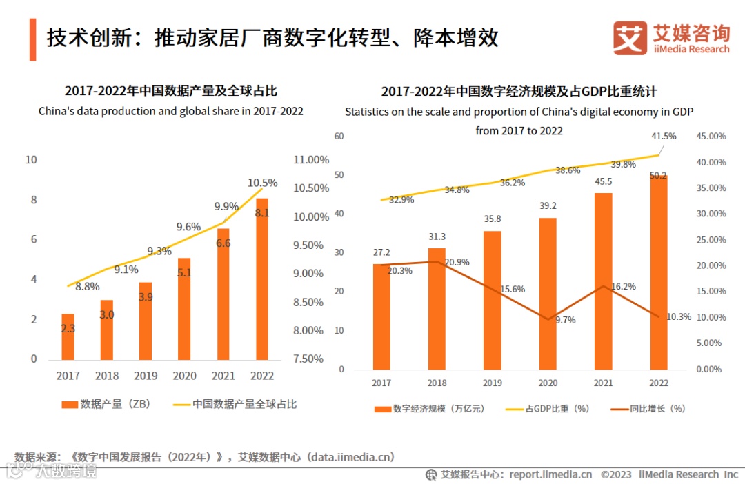 中国数据供给能力不断提升,数字技术与实体经济日益融合深化,新业态、新模式不断涌现,为家居售后服务提供更多可能性。数据显示,2017-2022年中国数据产量逐年递增,2022年已达8.1ZB,占全球数据产量的10.5%,位居世界第二;2017-2022年中国数字经济规模稳步增长,其中2022年达50.2万亿元,占GDP比重为41.5%。借助数字经济快速发展,中国家居厂商可通过互联网平台进行高效派单,跨区域解决家具安装等售后服务问题,实现降本增效,提升售后服务的效率和便捷性,满足消费者更高层次需求。