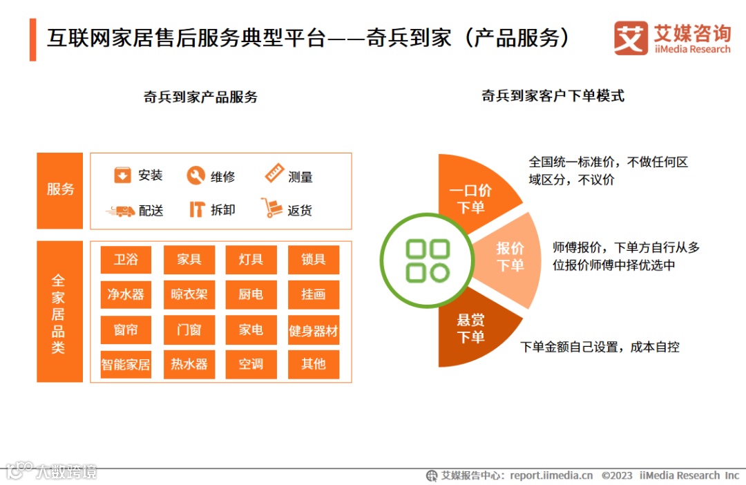 奇兵到家主要为客户提供安装、维修、测量、配送、拆卸、返货六项服务,服务类目覆盖全家居品类,包括家居、卫浴、灯具、锁具、墙纸等类目。一口价下单、报价下单和悬赏下单是奇兵到家客户下单的三种模式,商家可根据自身需求在官网、app、小程序、公众号等多种渠道进行下单,通过竞价的形式,以对自己有利的价格获取服务。奇兵到家拥有完善的售后服务体系,平台通过线上整合全国家电安装与维修师傅资源,解决商家与用户的家电安装和维修需求,同时帮助师傅接单引流,价格透明,服务具有保障。