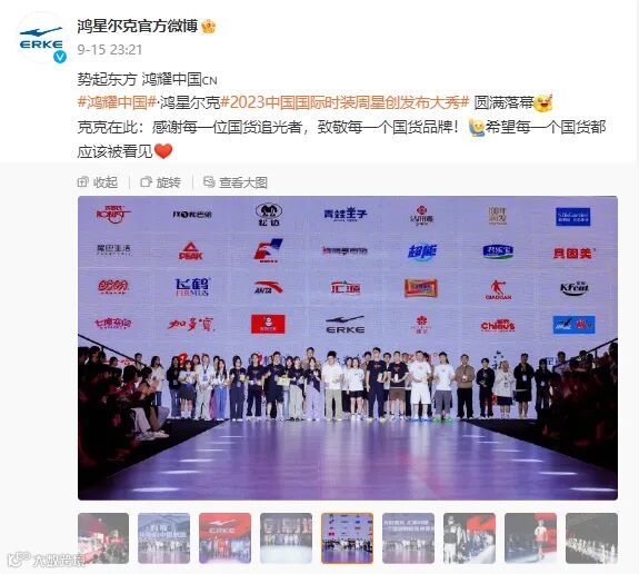9月15日,在“2023中国国际时装周星创发布大秀”中,鸿星尔克“携手”一众优质国货共同出席,用众多国货品牌汇聚起来的Logo墙来做背景。谢幕时工作人员人手一件国货从幕后走到台前,走出“众神归位”的气势。“无数星光,汇聚闪耀,每一个国货都应该被看见”。鸿星尔克来用自己的行动展现国货力量,展现国货魅力。