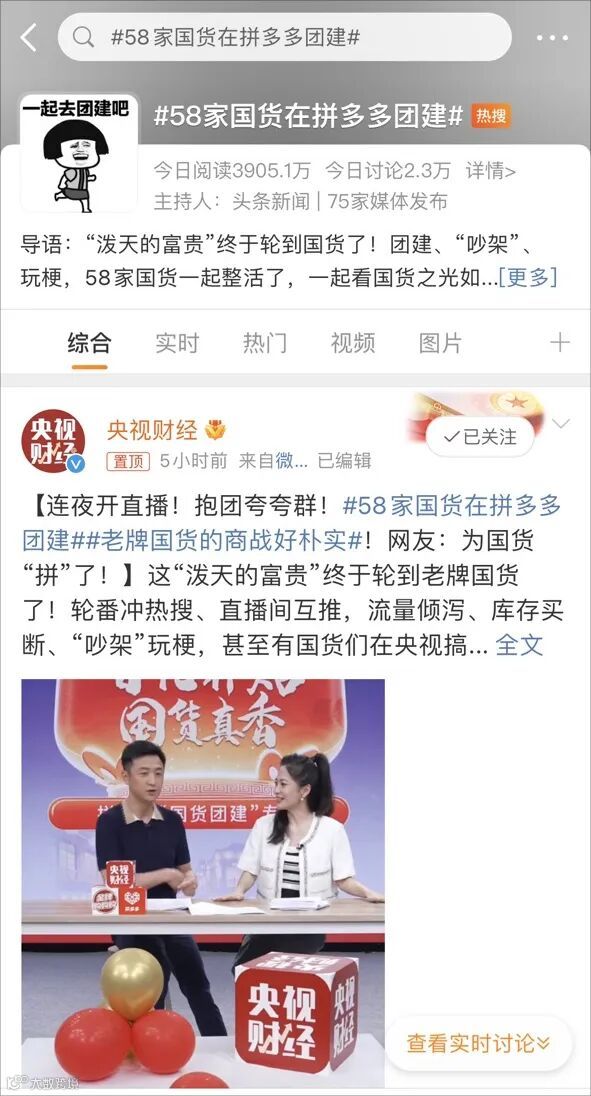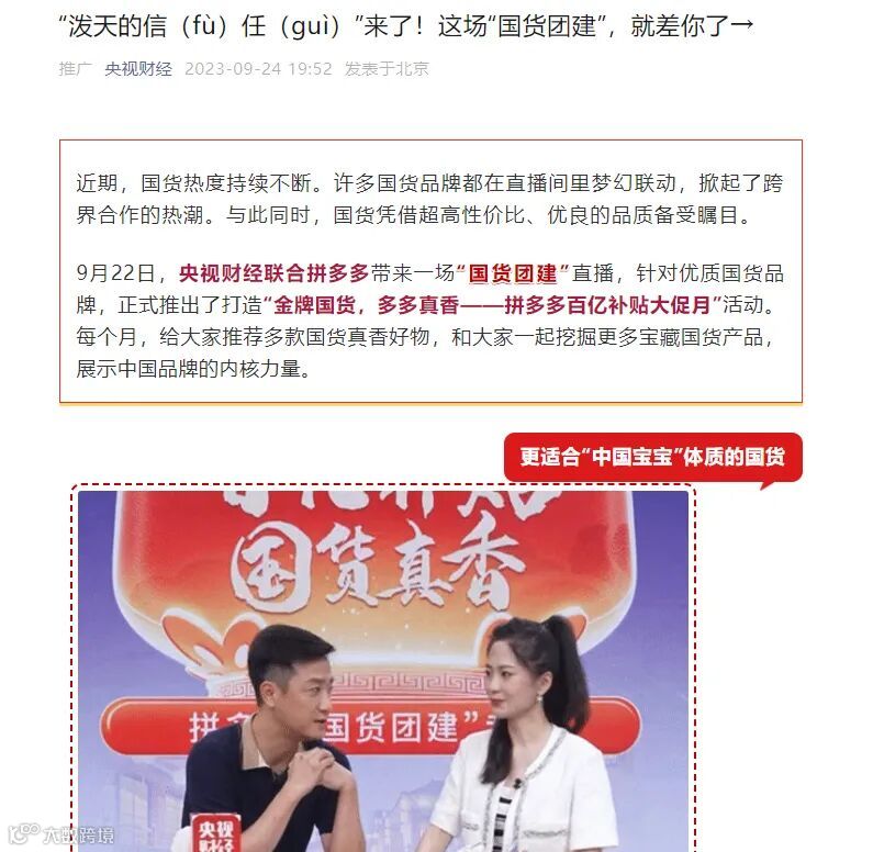 各国货直播间的活还没整完,央视的直播便开始了“闷声干大事”。9月22日,央视财经联合了拼多多带来一场“国货团建”直播活动,针对优质国货品牌,正式推出了打造“金牌国货,多多真香——拼多多百亿补贴大促月”活动。