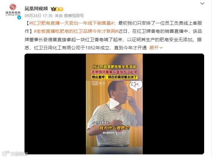 据悉,此次直播带货是中央广播电视总台大型融媒体活动《金牌新字号》的系列活动之一,也是央视财经联手拼多多开展“金牌国货 多多真香”系列活动。9月22日这场直播中,上海制皂、361°、孔凤春与鸿星尔克等多家国货企业负责人亮相,为直播间的网友带来了优价好物与品牌背后的故事。