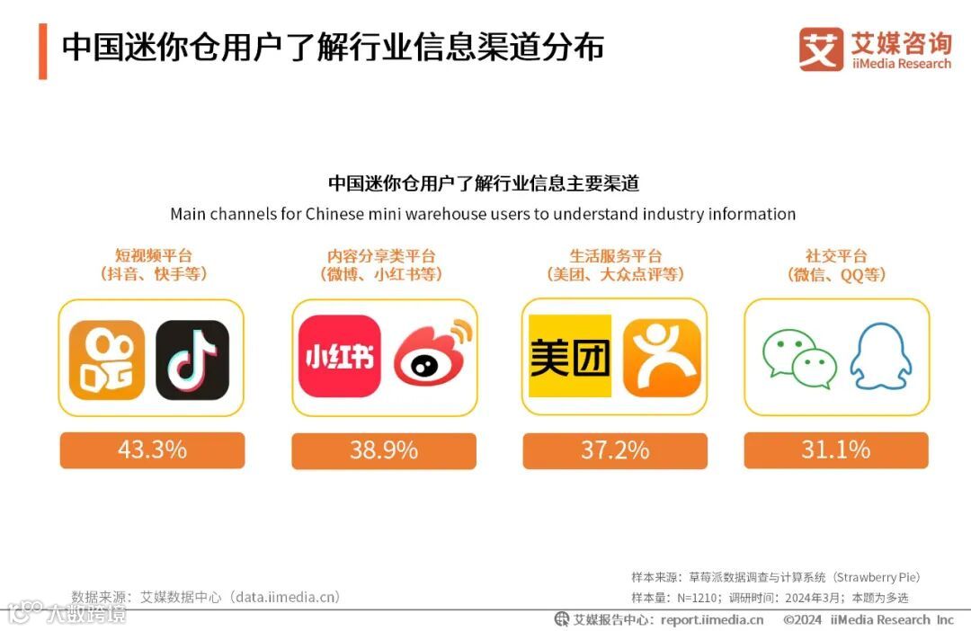 新媒体平台是中国迷你仓用户了解行业信息的主要渠道。iiMedia Research(艾媒咨询)数据显示,43.3%的用户通过以抖音、快手为代表的短视频平台了解行业信息,其次是使用内容分享类平台、生活服务平台与社交平台等功能性应用。艾媒咨询分析师认为,在平台社会中,迷你仓企业应洞察迷你仓用户媒介消费及使用习惯,借助平台流量优势进行营销。