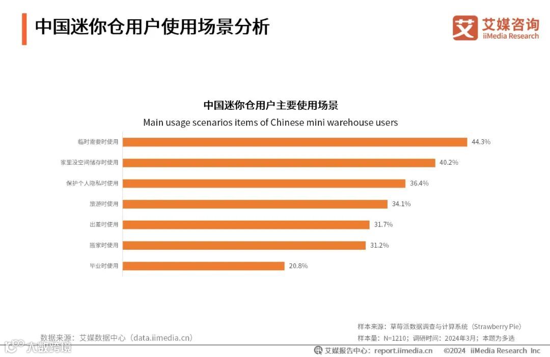 iiMedia Research(艾媒咨询)数据显示,“临时需要”是用户选择迷你仓的主要场景,占比44.3%;40.2%的用户因“家里没空间储存”而选用迷你仓;“保护隐私”、“旅游”、“出差”等场景也是用户使用迷你仓的重要场景。艾媒咨询分析师认为,用户看重迷你仓的周转与隐私保护作用,迷你仓企业在提升迷你仓仓储功能的同时,还应重视仓储空间的私密性。