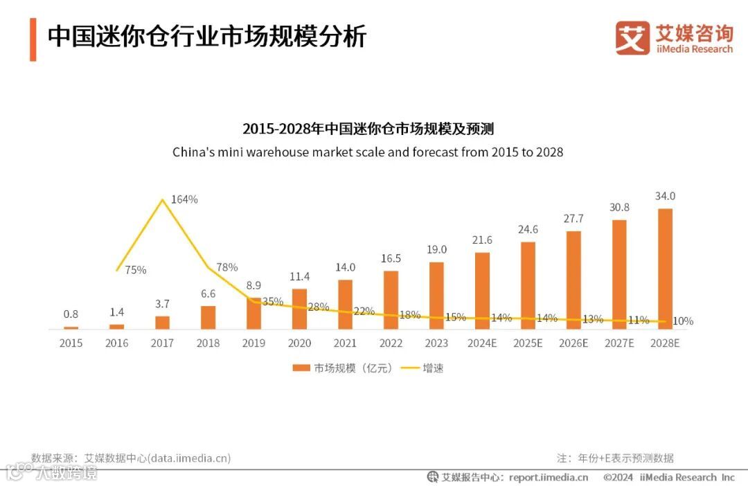 相较国外市场,中国迷你仓行业发展仍处在初始阶段。iiMedia Research(艾媒咨询)数据显示,2023年中国迷你仓行业市场规模为19.0亿元,同比增长15%,预计2028年有望增至34.0亿元。艾媒咨询分析师认为,迷你仓行业作为新兴行业,它的发展符合城市功能服务细分的发展趋势,具有较大的发展潜力。未来,随着迷你仓行业需求和观念上两大难点的逐步解决,中国迷你仓行业的红利将逐步释放。
