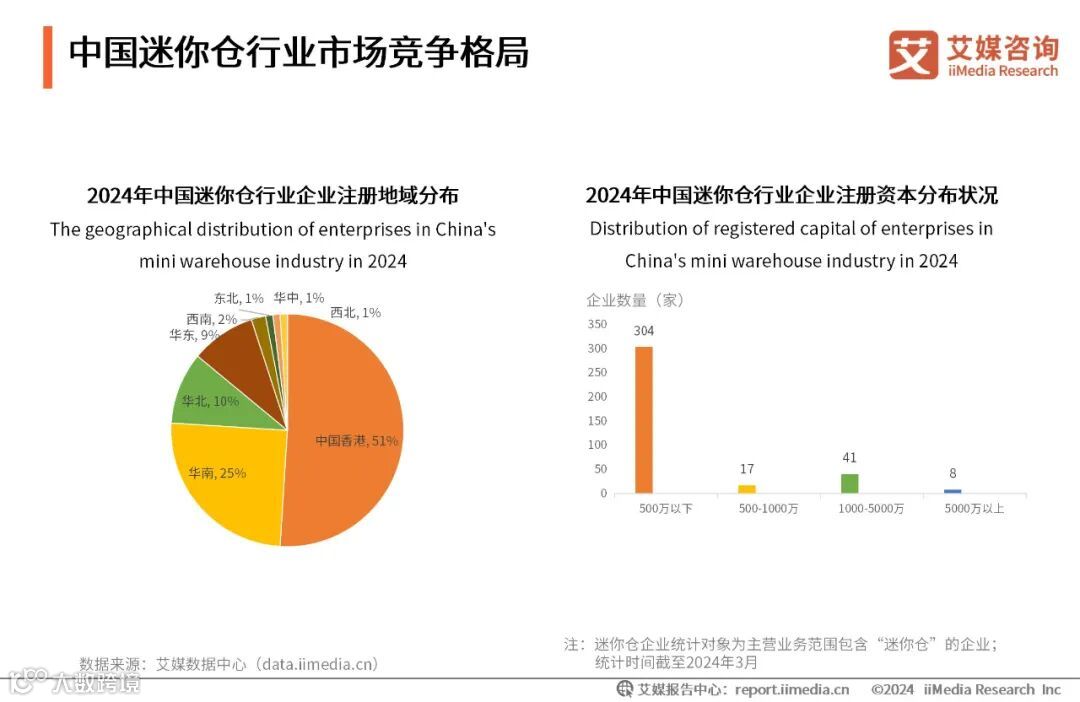数据显示,截至2024年3月,中国迷你仓用品企业数量为370家,其中注册资本在500万元以下的迷你仓企业数量最多,共有304家,占迷你仓企业总数的82%。注册资本在1000万到5000万之间的企业数量次之,共41家。注册资本在5000万以上的企业数量最少,仅有8家。艾媒咨询分析师认为,目前中国迷你仓行业以轻资产经营模式为主,众多迷你仓企业通过轻资产租房等模式实现品牌门店的快速扩张,该模式能够降低企业的初始投资成本,但也承担着市场租金波动带来的影响。