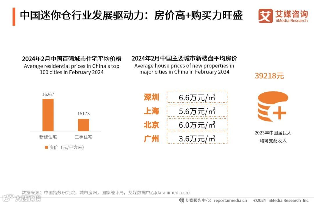 数据显示,2024年2月全国100个城市新建住宅平均价格为16267元/平方米,全国100个城市二手住宅平均价格为15173元/平方米,一二线城市房价坚挺,买不起房仍是大多数居民的痛点。此外,随着居民可支配收入的提升,人们的购买力越来越旺盛,储物需求也随之增加。在没有个人住宅的情况下,迷你仓成为了消费者进行物品仓储的优选,进一步利好行业发展。