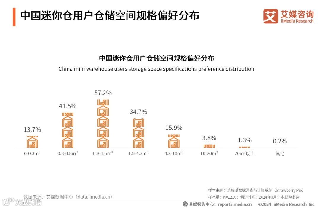 iiMedia Research(艾媒咨询)数据显示,小规格的迷你仓更受用户青睐,其中,选择存储空间在0.8-1.5m³的用户最多,占比57.2%。艾媒咨询分析师认为,企业应加大储物空间在0.3-4.3m³区间内的迷你仓投放力度,同时投放少量的大仓、微型仓以满足长尾需求。