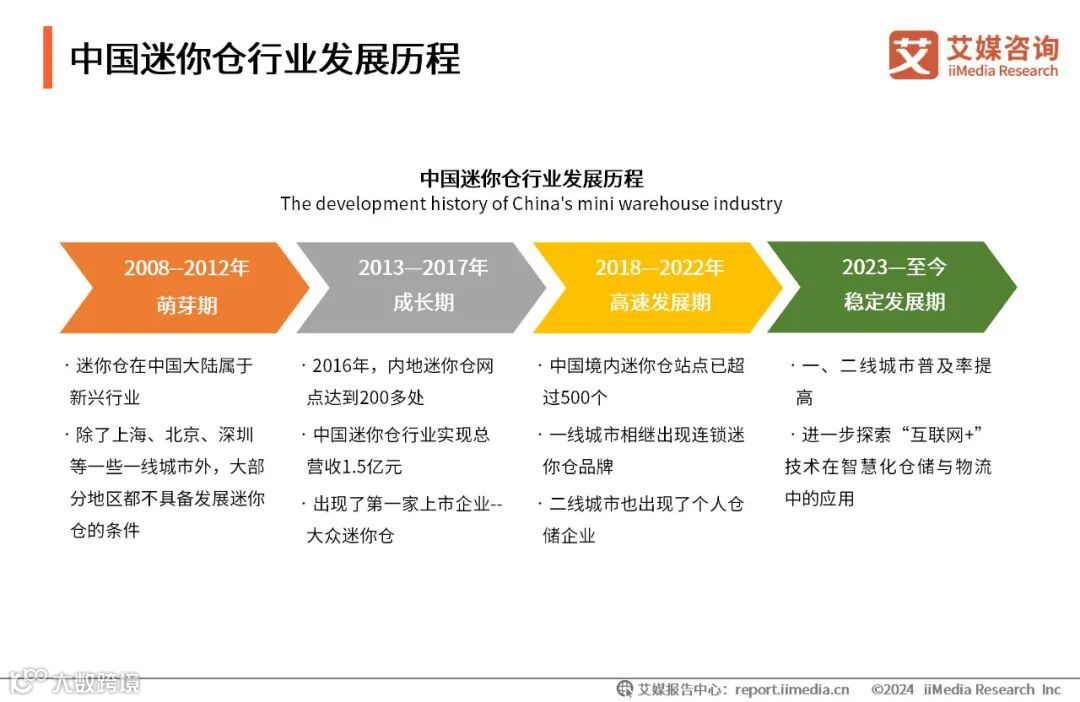 迷你仓在中国大陆最早出现于2007年至2008年之间,在内地已经发展了16年。迷你仓经过了漫长的摸索阶段,从只在北上广深出现的萌芽期,到网点向全国扩大、第一家迷你仓企业上市的成长期,再到规模扩张的高速发展期,持续向技术升级的稳定期发展。