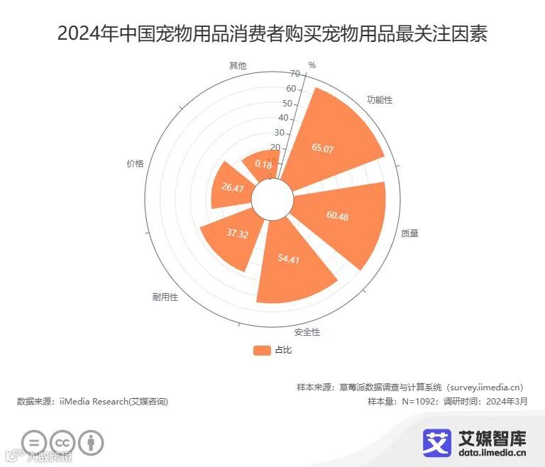 iiMedia Research(艾媒咨询)调研数据显示,宠物用品消费者每月购买频率主要集中在每月1-4次(94.85%);购买宠物用品时最关注因素中,65.07%的消费者更关注功能性,60.48%的消费者更关注质量,54.41%的消费者更关注安全性,耐用性、价格等也是消费者考虑的因素之一。