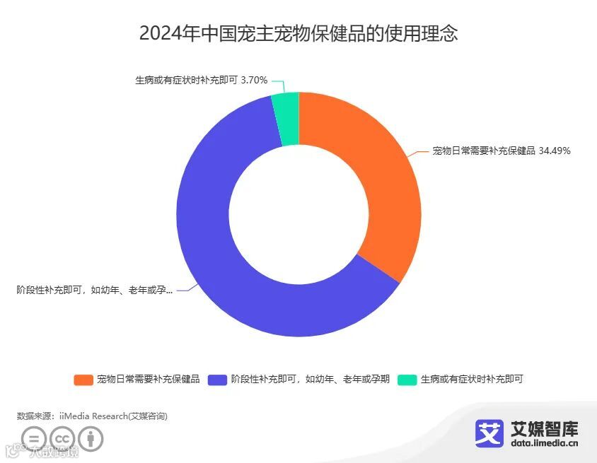 iiMedia Research(艾媒咨询)调研数据显示,有79.41%的宠物主会给自己的宠物使用宠物保健品。有34.49%的消费者会表示宠物日常需要补充保健品,更多的消费者(61.81%)会选择阶段性补充(如幼年、老年或孕期),另有3.70%的消费者会选择仅在宠物生病或有症状时补充。