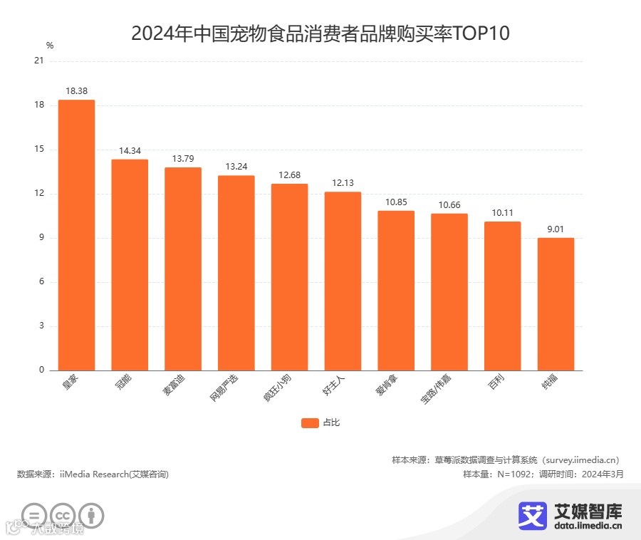 在2024年中国宠物食品消费者品牌购买情况中,18.38%的消费者会选择购买皇家,14.34%的消费者会选择购买冠能,13.79%的消费者会选择购买麦富迪,13.24%的消费者会选择购买网易严选。