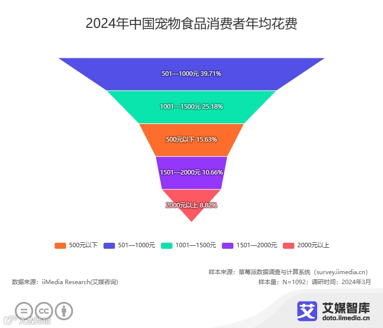 数据显示,2023年中国居民人均可支配收入达39218元。国民收入的增长带动了居民购买能力的提升,国民对生活质量的要求也越来越高。在中国国民经济消费水平持续增长的背景下,居民愈发注重生活品质,消费观念由“吃得饱”向“吃得好”转变,连带着宠物的饮食也随之升级。iiMedia Research(艾媒咨询)调研数据显示,中国宠物饲养者每月进行宠物食品消费的频次集中在1-2次或3-4次,有八成以上的消费者年均消费超过500元,多数集中在501-1500元(64.89%)。