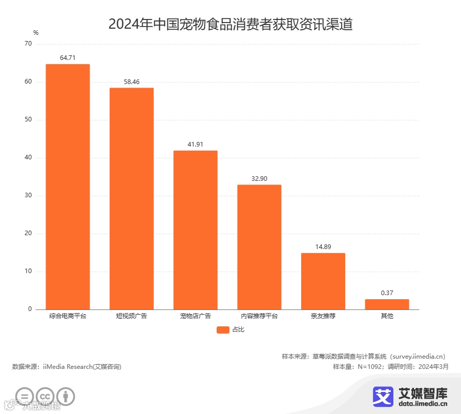 iiMedia Research(艾媒咨询)调研数据显示,综合电商平台是中国宠物食品消费者获取资讯的主要途径,占比达64.71%。这种直观且互动性强的信息展示方式,不仅增强了消费者对产品的了解,也更容易激发他们的购买欲望。消费者在浏览电商平台时,往往会被生动的产品展示和真实的用户评价所吸引,进而产生购买行为。