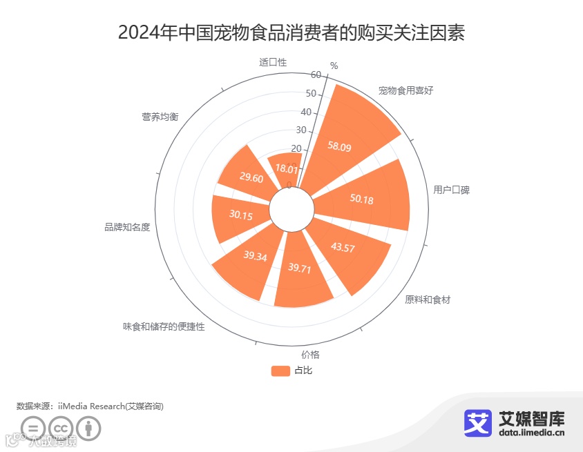 iiMedia Research(艾媒咨询)调研数据显示,中国消费者购买宠物食品的需求较多样化,在宠物食品关注因素中,消费者最为关注宠物的食用喜好(58.09%),其次为用户口碑(50.18%)和产品原料食材(43.57%)。随着宠物在人们生活中的地位逐渐提升,人们对宠物食品的质量要求也在不断提高,良好的品牌口碑将有助于增加消费者粘性及提高消费者复购率。