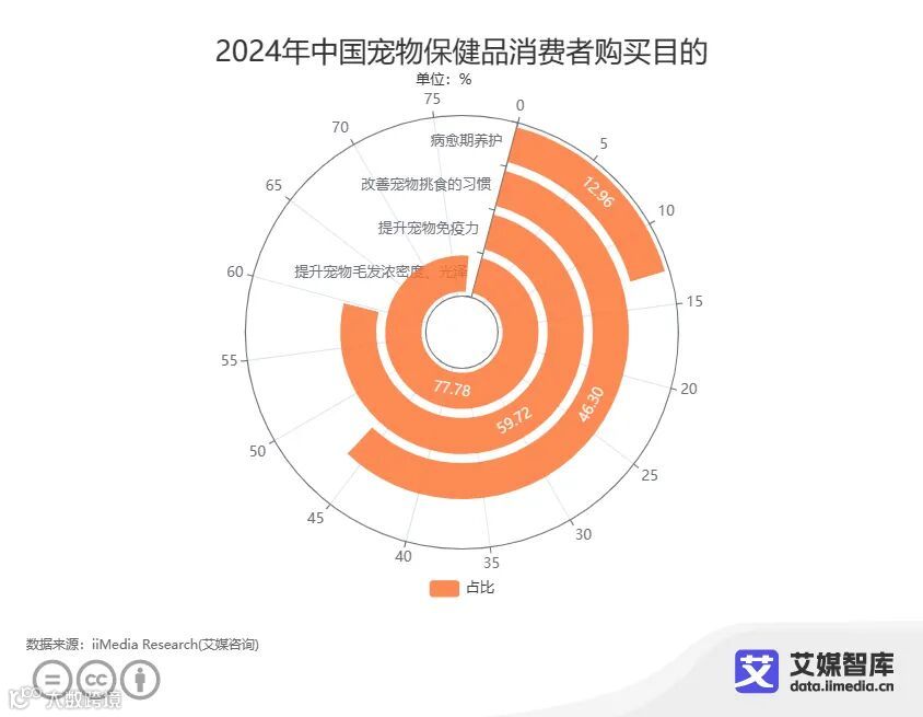 iiMedia Research(艾媒咨询)调研数据显示,消费者购买宠物保健品,有77.78%的消费者是为了提升宠物毛发浓密度、光泽,59.72%的消费者是为了提升宠物免疫力,46.30%的消费者为了改善宠物挑食的习惯,另有12.96%的消费者是为了宠物的病愈期养护。