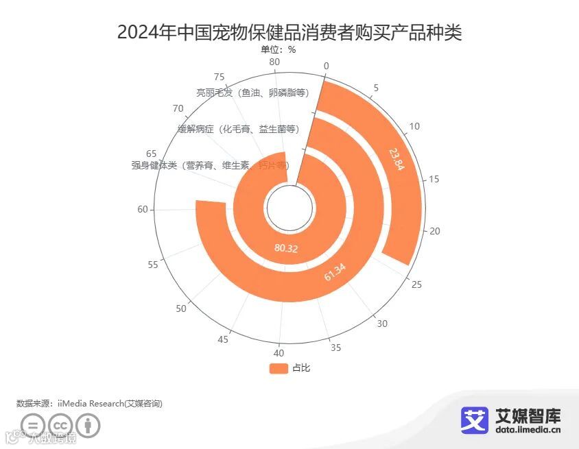 在2024年中国宠物保健品消费者购买产品种类中,营养膏、维生素、钙片等强身健体类产品更受欢迎(80.32%),其次是化毛膏、益生菌等缓解病症类产品(61.34%)和鱼油、卵磷脂等亮丽毛发产品(23.84%)。