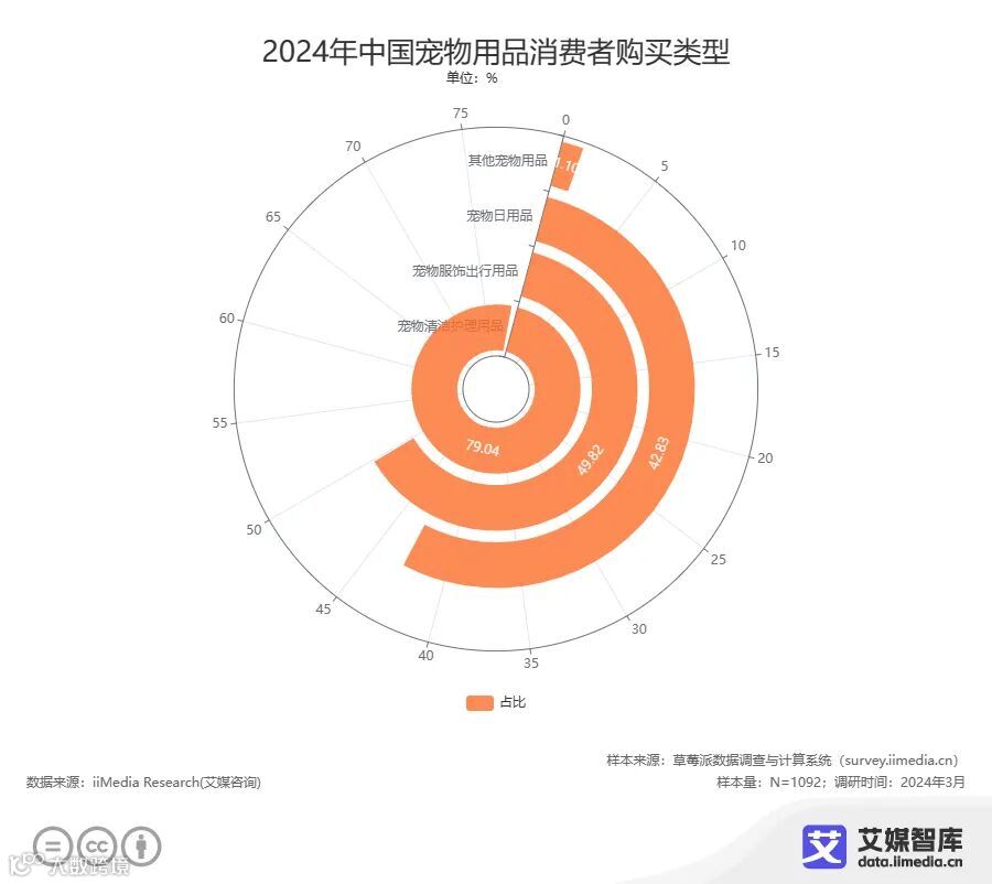 消费者对于宠物用品需求增加促进消费增长,推动了细分领域不断增加。iiMedia Research(艾媒咨询)调研数据显示,79.04%的消费者购买过宠物清洁护理用品,49.82%的消费者购买过宠物服饰出行用品,42.83%的消费者购买过宠物日用品。